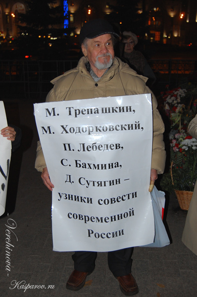 Касьянов отметил в своем выступлении, что "методы нынешней власти все больше и больше напоминают методы КГБ". Директор движения "За права человека" Лев Пономарев зачитал список осужденных по делу "ЮКОСа", а Аверин перечислил имена нацболов-политзеков.