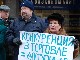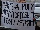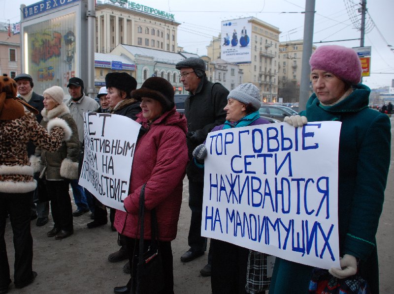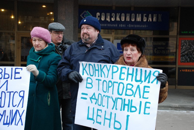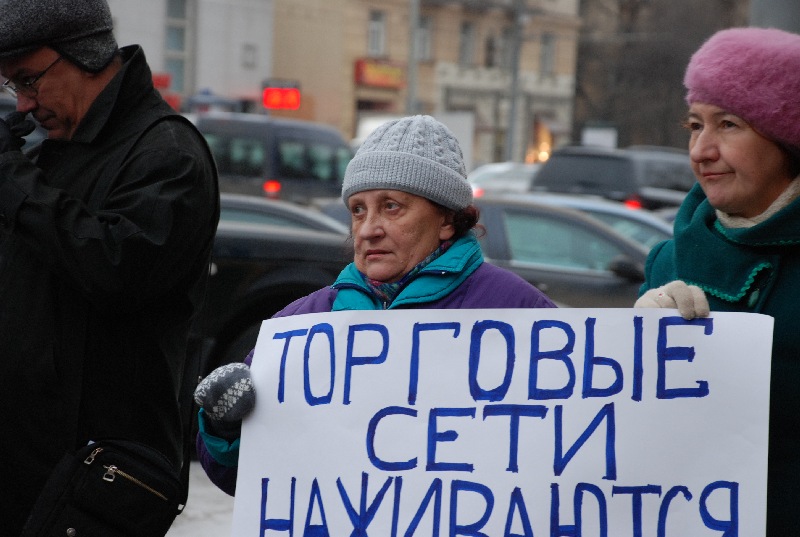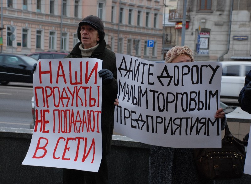 Участники держали плакаты: "Наши продукты не попадают в сети", "Нет спекулятивным ценам на продукты!", "Дайте дорогу малым торговым предприятиям", "Торговые сети наживаются на малоимущих" и "Конкуренция в торговле=доступные цены".