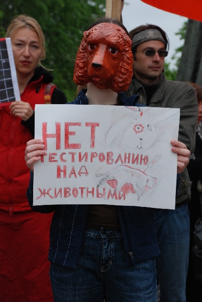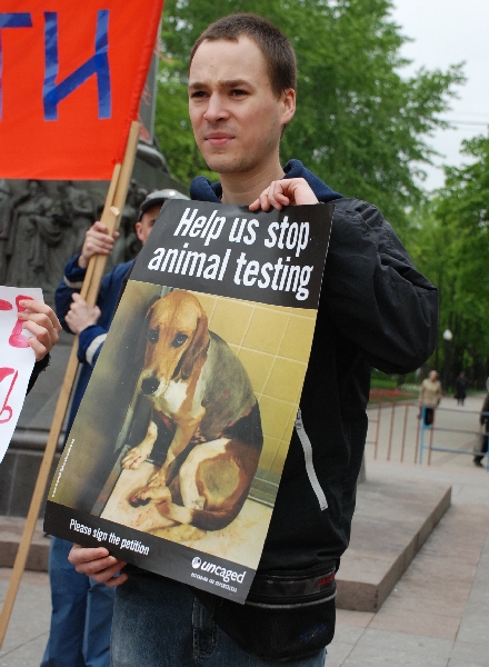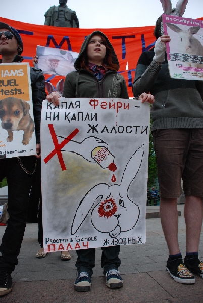 "Фэйри" купил — животное убил!" — с таким лозунгом выступили зоозащитники на пикете против тестирования косметики и бытовой химии на животных 16 мая в Москве. Об этом сообщил корреспондент Каспаров.Ru.