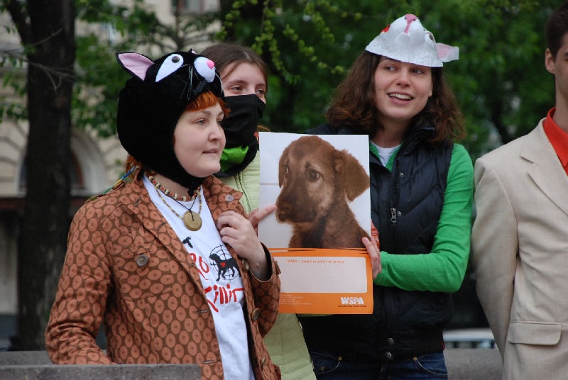 Прохожим раздавались листовки, в которых перечислялись фирмы, производящие парфюмерию и косметику с тестированием продуктов на животных, и их конкуренты, которые этого не делают.