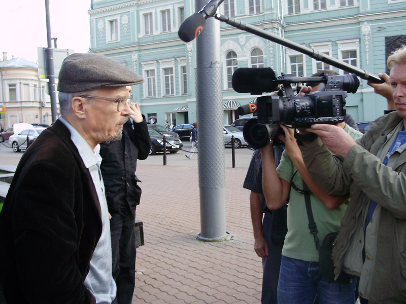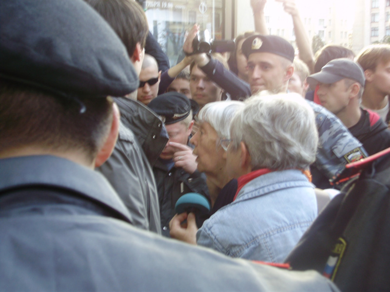 Не было слышно, что именно говорила председатель МХГ: она то вступала в спор с окружавшими ее омоновцами, то разговаривала с кем-то по телефону. Затем Алексеева в кольце силовиков, отсекавших журналистов, спустилась со ступенек Театра сатиры на Триумфальную площадь. Там к ней подошел начальник управления информации ГУВД Москвы полковник Виктор Бирюков, у которого Алексеева стала выяснять, когда отпустят Льва Пономарева.
