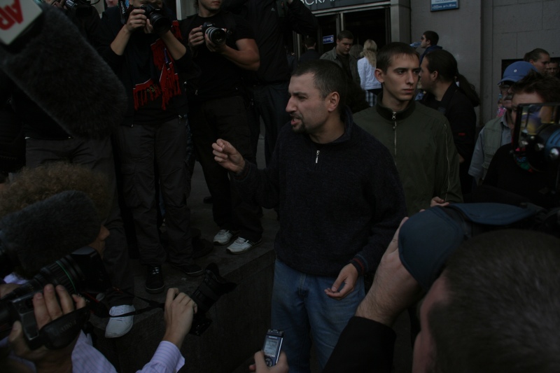 Почти сразу после этого на выходе из метро появился один из лидеров "Другой России" Сергей Аксенов, которого сразу плотным кольцом окружили журналисты. Аксенов заявил, что, несмотря на неправомочные запреты, оппозиция все равно будет выходить на Триумфальную площадь каждое 31-е число. В этот момент, фактически расшвыряв журналистов, к нему подлетели омоновцы, схватили и "вынесли" в сторону автобуса.