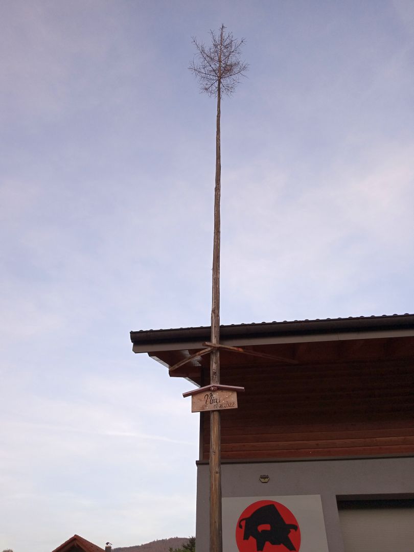 В глубинке же распространён несколько иной символ и обычай. Здесь на каждой улице возле дома стоит шест с высоченной елкой, чуть ниже прикручен аист с именем и датой. По надписи и дате можно догадаться, что недавно в этом доме родился малыш. Иногда изобретательный отец к знаку может добавить какой-нибудь аксессуар, например брандспойт. Мол, точно мальчик! И есть мнение, что он должен стать пожарным, как папа. На елку родственники, друзья и все причастные к знаменательному событию привязывают ленточки с пожеланиями к аисту такого же счастья в семью. Такой знак стоит около полугода.